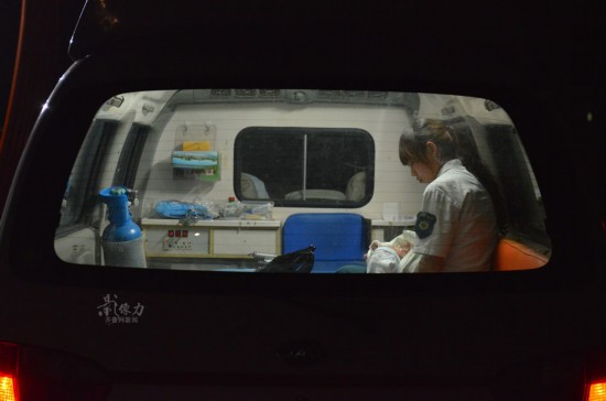 黑夜中,医护人员怀抱弃婴,正在等待将弃婴送往医院检查。(齐鲁网记者 于鹏 满倩)