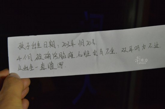 婴儿身上留下的纸条。齐鲁网记者 于鹏 满倩