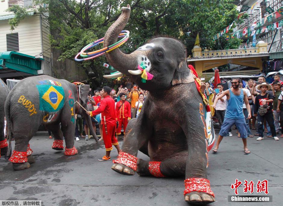 当地时间2014年6月13日,曼谷,庆祝巴西世界杯开幕,曼谷街头惊现大象足球世界杯。大象们被涂上各国国旗在街头“踢球”,吸引众人观看。