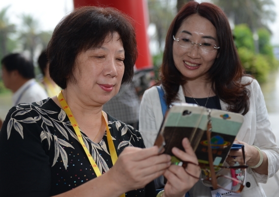 6月15日,嘉宾通过手机将自己参加第六届海峡论坛大会的消息传给台湾的亲友。