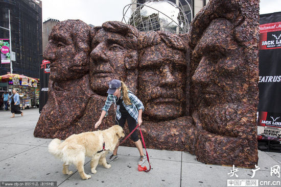当地时间2014年6月12日,美国纽约,美国杰克林克牛肉干公司为庆祝6月12日举办的第三届国际牛油干节,用肉干仿造美国拉什莫尔山(美国总统山)的总统雕像,场面非常壮观。据悉,杰克林克牛肉干公司动员20名员工,耗费1400个小时才制作出13英尺(约4米)高,17英尺(约5米)宽,体积1400立方英尺(约40立方米),重达1600磅(约725公斤)的庞然大雕塑。