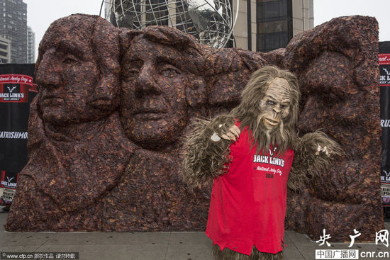 当地时间2014年6月12日,美国纽约,美国杰克林克牛肉干公司为庆祝6月12日举办的第三届国际牛油干节,用肉干仿造美国拉什莫尔山(美国总统山)的总统雕像,场面非常壮观。据悉,杰克林克牛肉干公司动员20名员工,耗费1400个小时才制作出13英尺(约4米)高,17英尺(约5米)宽,体积1400立方英尺(约40立方米),重达1600磅(约725公斤)的庞然大雕塑。