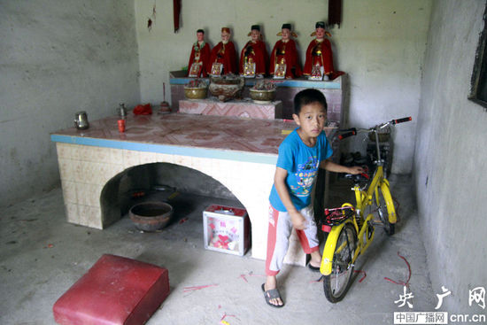 读三年级的谢树华,今年11岁,广东省高州市石古镇人,是一名孤儿,因为家中房屋全部倒塌,无处栖身,现在只能在村中寺庙居住,一住就是半年多。据了解,谢树华的爷爷是独子,父亲也是独子,在他很小的时候,父亲就患病去世。妈妈也因为得知父亲患病,无法医治,对生活丧失信心,在父亲病逝前也远走他乡,至今渺无音讯。前几年,村中热心邻居见其房屋倒塌,无处居所,就好心收留他居住,后来因为邻居家中房子也倒塌了一半和年纪逐大,力不从心,难以管教,只好忍心将他“赶走”。