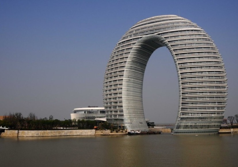 中国湖州喜来登温泉度假酒店,指环型形状,可谓国际首创、中国唯一。主体建筑充分利用了太湖良好的水资源,将水的动、静之美相结合,完美体现出国际化设计理念,建成后还将申报世界十大著名建筑??烧庥凶殴驶杓评砟畹钠咝羌毒频?,被网友调侃外形酷似翻起来的“马桶盖”,网友“管它春夏与秋冬天天乐”称之为:“白金七星级马桶盖”。