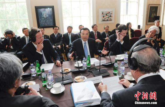 当地时间6月17日下午,中国国务院总理李克强在伦敦与英国首相卡梅伦共同出席中英全球经济圆桌会。 中新社发 刘震 摄