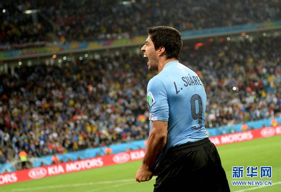 6月19日,乌拉圭队球员路•苏亚雷斯赛后庆祝球队获胜。