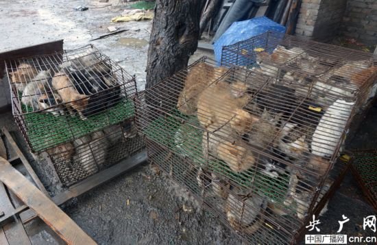2014年06月19日,在太原市尖草坪区阳曲镇阳曲村附近的一家饭店院内,有一百多只猫被装在铁笼中。