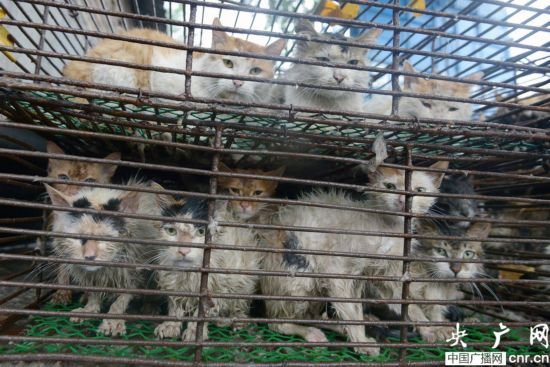 2014年06月19日,在太原市尖草坪区阳曲镇阳曲村附近的一家饭店院内,有一百多只猫被装在铁笼中。