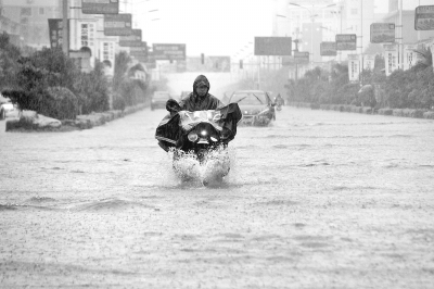 6月1日,路人在江西省瑞昌市赤乌中路的积水中骑行。 新华社发(魏东升摄)