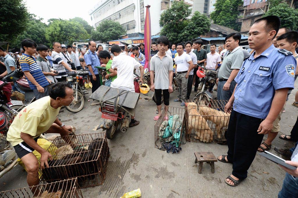 10点一刻,在这么多卖活狗的狗笼旁,有了5个卖狗肉的摊位,这是六月份以来都没有过的。在大市场旁边的街道上,有不少卖狗肉的三轮车。街上多了很多穿着制服的城管,对占道经营的行为进行清理。垌口菜市场门口,被堵得寸步难行。一些记者为了方便采访,站在了附近停放的三轮车上,围着愿意讲话的商贩或市民,大量相机、手机“咔咔” 拍照。图片来源:CFP