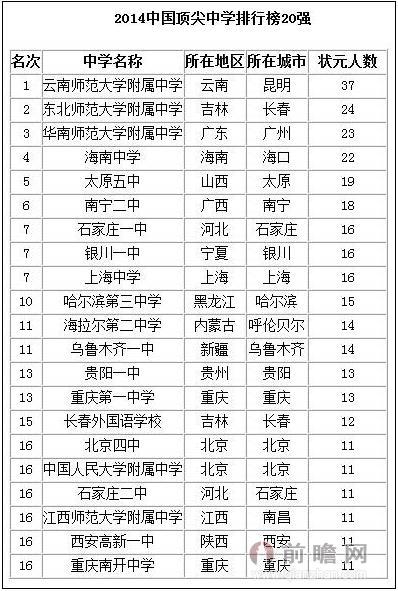报告显示,在中国校友会网调查到的1977-2013年中国各地区高考状元中,云南师范大学附属中学培养的高考状元人数最多,有37人,雄居中国校友会网2014中国顶尖中学排行榜榜首,连续2年荣膺“中国高考状元摇篮”美誉;东北师范大学附属中学有24人,居第二;华南师范大学附属中学有23人,列第三;海南中学有22人,列第四;太原五中有19人,列第五;南宁二中有18人,居第六;石家庄一中、银川一中和上海中学各有16人,并列第七;哈尔滨第三中学有15人,位居第十。