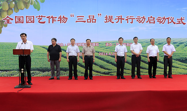 6月20日,农业部在四川蒲江启动园艺作物“三品”提升行动,即以稳定水果、茶叶面积为前提,以品种改良、品质改进、品牌创建为重点,稳面积,提质量,调结构,保增收,创品牌,力争用3—5年时间,在全国水果、茶叶优势产区,建设良种苗木繁育基地100个,打造千亩精品果(茶)园1000个,培育有影响力的品牌200个。