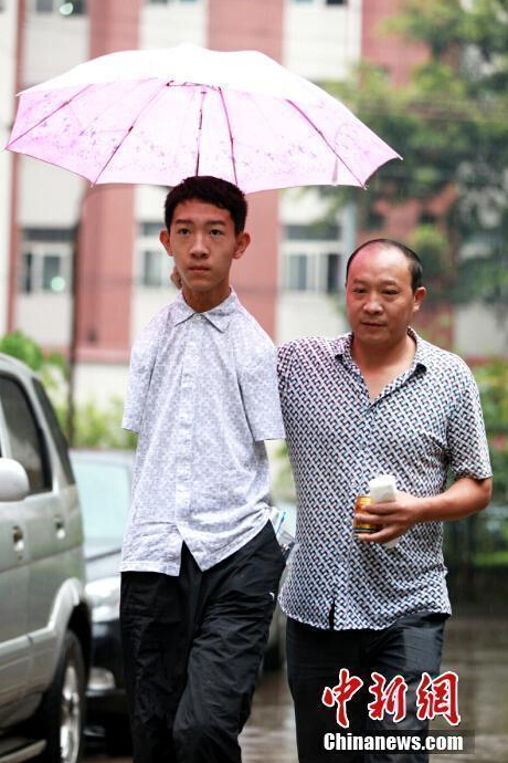 图为高考第一天,父亲彭昌富打着伞送儿子前往考场。