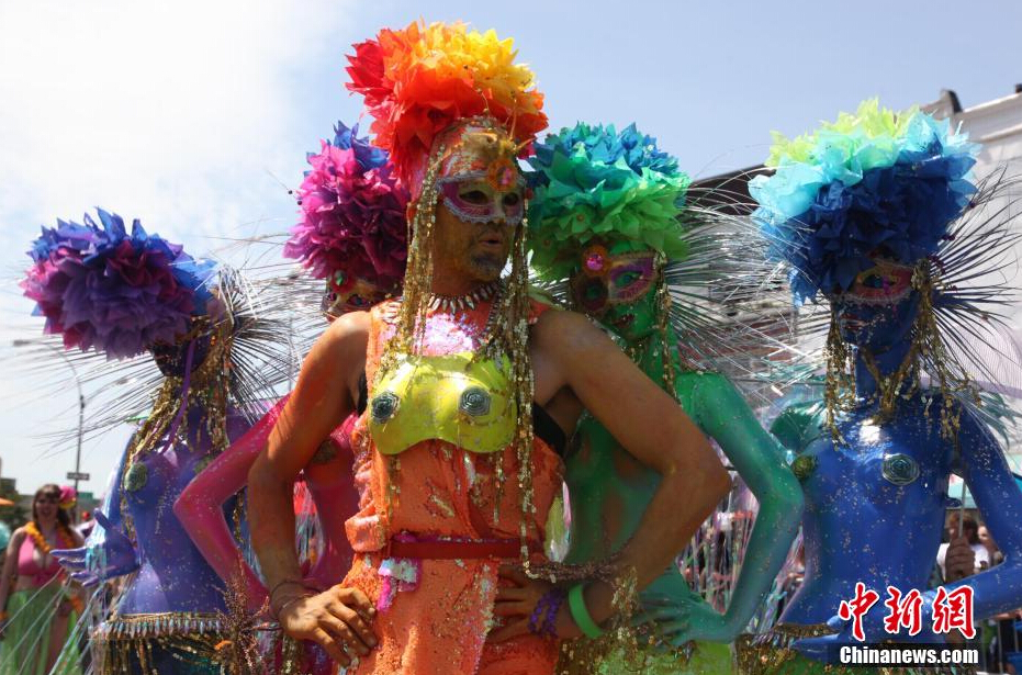 当地时间6月21日,纽约市举行第32届康尼岛美人鱼大游行。当天下午,热情奔放的纽约人穿上色彩鲜艳的服装,装扮成各种海洋生物,一路且歌且舞尽情表演??的岬好廊擞阌涡惺桥υ家荒暌欢鹊南娜帐⒌?,也是纽约市最盛大的旅游活动之一。据称,今年将有80万来自世界各地的游客在现场观看游行表演。中新社发 阮煜琳 摄