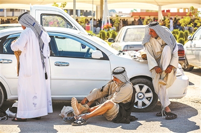 6月24日,伊拉克卡尔巴拉,志愿军人穿上新发的军靴供图/IC
