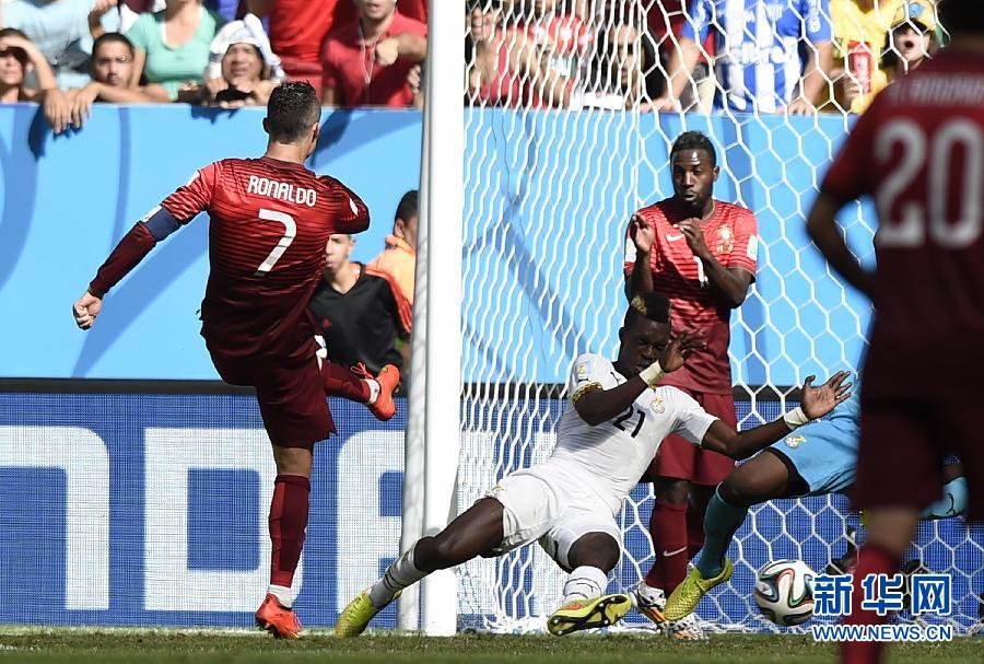 6月26日,葡萄牙队球员克·罗纳尔多(左)射门得分瞬间。当日,在巴西巴西利亚马内·加林查国家体育场进行的2014年巴西世界杯小组赛G组比赛中,葡萄牙队对阵加纳队。 新华社记者戚恒摄