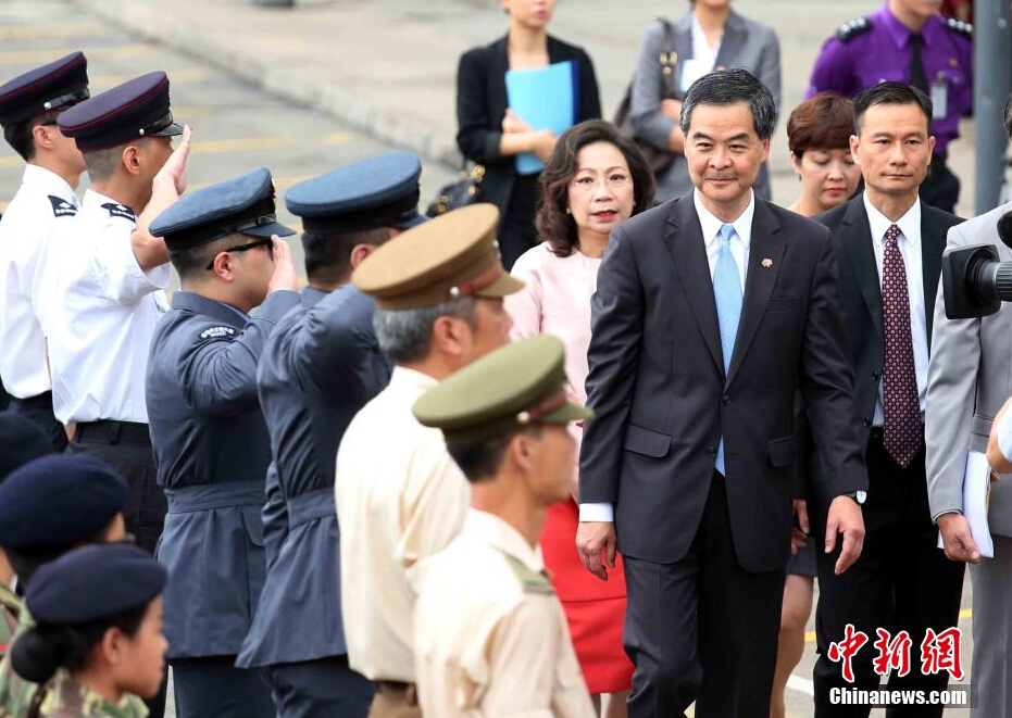 7月1日上午,香港特区行政长官梁振英伉俪在金紫荆广场出席升旗仪式,庆祝香港特别行政区成立十七周年。中新社发 洪少葵 摄