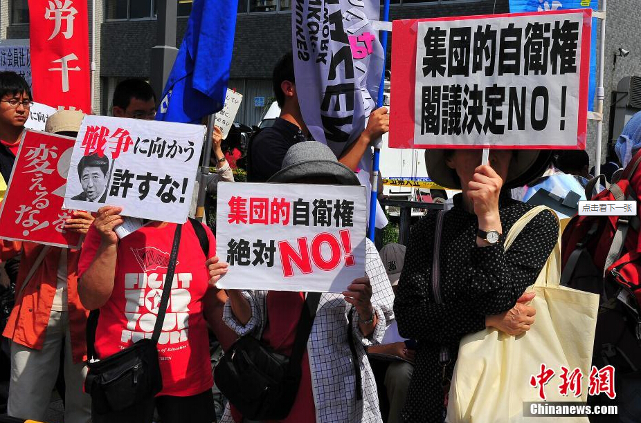 日本政府在7月1日的内阁会议上,正式决定为解禁日本战后一直被否定使用的集体自卫权而修改宪法解释。此举遭到许多日本民众的强烈抗议。图为当日下午,日本民众在首相官邸前抗议解禁集体自卫权,要求立即中止内阁会议。中新社发 王健 摄