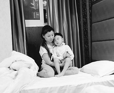 由于肿瘤对脑部神经的压迫,邱宬灏的手脚逐渐变得僵硬,大部分时候只能在床上躺着,或者靠在父母身上,或者让父母抱着。孩子清澈的眼神变得混浊,右眼甚至已经睁不开。