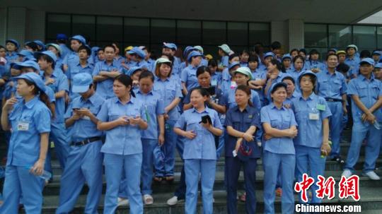 东莞一日企社长发表侵华战争不当言论遭上千工人抗议。图为工人聚集在厂门口表达抗议?!“仓卤辍∩?/p>
