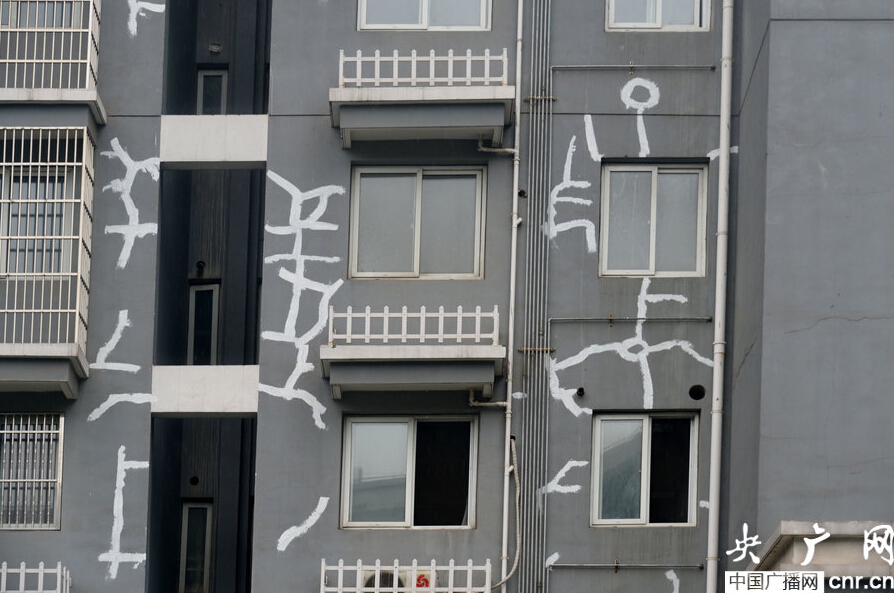 2014年7月1日,江苏常州,武进区遥观镇宋剑湖家园的一幢安置房像“缠满了绷带”,看上去很不美观。(来源:中国广播网)