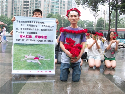 6月30日,成都市武侯区航空路新希望大厦外,一名男子带着14个人集体下跪,手举标志牌向新希望集团董事长刘畅借款100万元治病,上面写着“借我一百万,我打工还你一辈子”的字样。