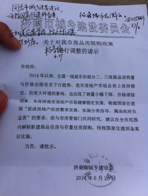 7月2日,一份名为《关于对我市商品房限购政策调整的请示》的文件见诸网络。这份署名为济南市城乡建设委员会的文件,上报对象为“市政府”,主要内容是建议在商品房销量及价格双双下行的趋势下,在全市范围内解除新建商品住房与存量住房限购。