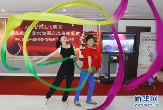 6月26日,中国甘肃省歌舞剧院编导高妍妮(左)在韩国首尔文化中心教授韩国学生练习敦煌舞。中韩两国一衣带水,源远流长的文化交往,形成了“韩流”和“汉风”的相互交融。近年来,随着中国影响力的提升和中韩关系的发展,在《来自星星的你》等热门韩剧风靡中国的同时,在韩国也刮起了习习“汉风”。目前,韩国的中文培训机构以年平均20%的速度增长,学习中文的学生人数成倍增长。汉字、儒家文化、中华料理等中国元素在韩国各地随处可见,已深深融入了韩国人的生活。新华社记者姚琪琳摄