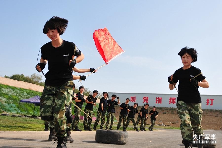 新疆公安边防总队训练基地女子特战队员正在进行拉轮胎百米冲刺训练。