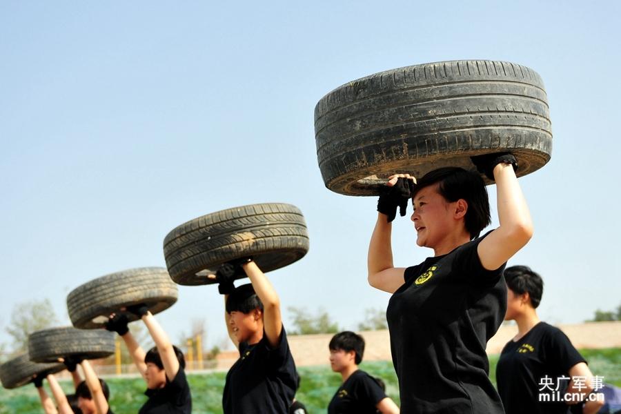 新疆公安边防总队训练基地女子特战队员正在进行托举轮胎训练,强化上肢力量。