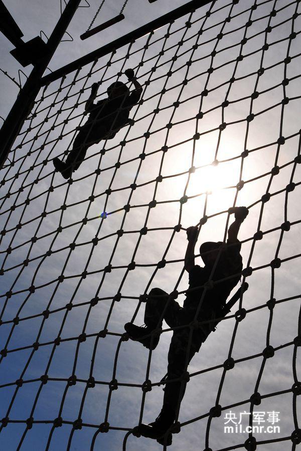 新疆公安边防总队训练基地女子特战队两名狙击手正在进行攀爬占领制高点训练。