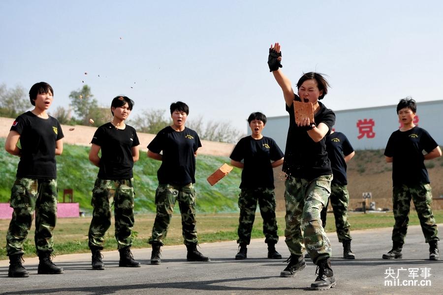 新疆公安边防总队训练基地女子特战队员李换利用训练间隙休息时间,给其他队员表演硬气功。