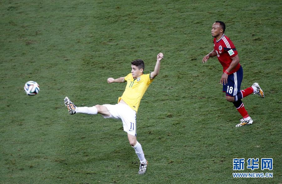 7月4日,巴西队球员奥斯卡(左)在比赛中。当日,在巴西福塔莱萨卡斯特洛竞技场进行的2014年巴西世界杯四分之一决赛中,巴西队对阵哥伦比亚队。 新华社记者廖宇杰摄