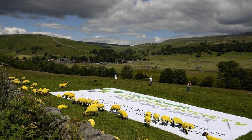 7月5日,在环法第一赛段的路边,成群的绵羊被漆成了代表环法黄色领骑衫的黄色。当日,第101届环法自行车赛在英国小城利兹开赛,英国威廉王子、凯特王妃和哈里王子出席了开幕式。捷安特-禧玛诺车队的德国车手基特尔以4小时44分07秒获得揭幕战冠军。新华社/法新