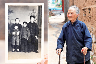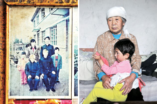 ▲上图(左侧)山西省壶关县河东村村民李月花(后左)年轻时和家人合影;(右侧)90岁的李月花在家门口散步。李月花的丈夫已经去世,两个儿子在外工作,自己一个人孤独地在村里生活。下图(左侧)山西省壶关县郭家碣村村民郭英则(前排左一)和家人的合影;(右侧)郭家碣村80岁的郭英则抱着重孙女坐在床上。郭英则有一个儿子现在外地打工,丈夫任有水身体不好已卧床多年。
