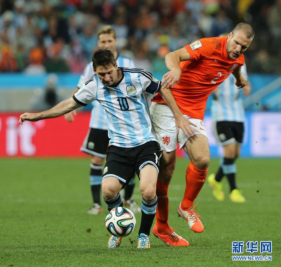 7月9日,阿根廷队球员莱•梅西(左)与荷兰队球员罗·弗拉尔在比赛中拼抢。当日,在巴西圣保罗伊塔盖拉球场进行的2014年巴西世界杯半决赛中,荷兰队对阵阿根廷队。新华社记者徐子鉴摄
