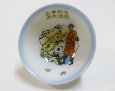 封峻松递给记者一只小酒盅,白瓷蓝沿,瓷胎很薄,里面画的是一张局部中国地图,标着南京、上海、北京等地,地图前面印着一名端着步枪、戴着头盔的日军士兵,还有一面日本国旗插在中国城楼状的建筑上。酒盅内沿,分别烫金印着“支那事变凯旋纪念”、“吉田”字样。