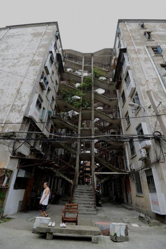 2014年7月9日,广西南宁市,在唐山路一居民区里面有一栋很奇特霸气的楼层建筑。楼层之间通过一个双向楼梯层层相连,连连相扣,十分霸气。