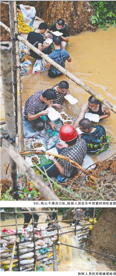 “吃了再干。”水中,抢险的现场指挥员———金华镇政府武装部部长张建军提醒大家,为防止再次下雨造成二次意外,以及天黑后不利于抢险等因素,所有抢险工作必须傍晚完成,希望水中和岸上的抢险人员再加把劲。水里,其他10名抢险人员,一边埋头吃饭,一边点着头。