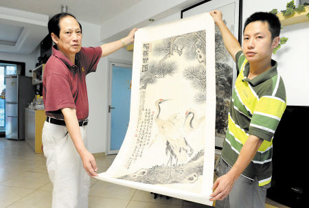 →昨日,陈树和父亲陈书良一起展示陈暄将军在抗战中缴获的侵华日军的画作《松鹤同春图》。均为石祯专 摄