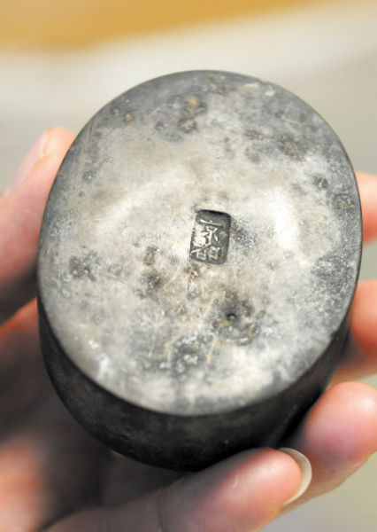 昨日,陈树展示的祖父在抗战中缴获的侵华日军的墨盒上印有“京都”字样。本报讯(记者 石祯专)刚刚过去的7月7日是全民族抗战爆发77周年纪念日,家住长沙咸嘉新村小区的陈树向本报热线96333打来电话,说他家至今保留着爷爷缴获的日本人画作《松鹤同春图》和落款有“京都”字样的墨盒。昨日,记者有幸目睹了这些保存了70多年的珍贵历史物件。湖南省博物馆原馆长、省收藏家协会原会长熊传薪表示,缴获的侵华日军画作和墨盒在我省是首次出现,在全国也不多见,这是日本侵华的有力物证,具有很高的历史价值。