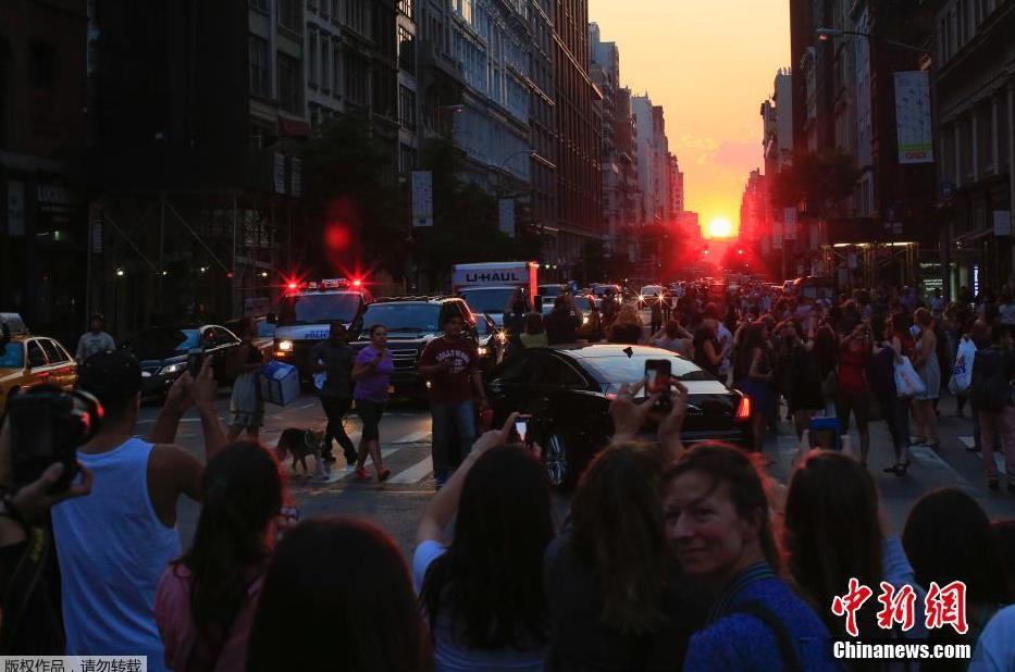 当地时间7月11日,美国纽约曼哈顿再现“曼哈顿悬日”景观,引得路人纷纷围观。据悉,曼哈顿街道大多呈棋盘布局,每年5月底和7月初各有一天日落时分,太