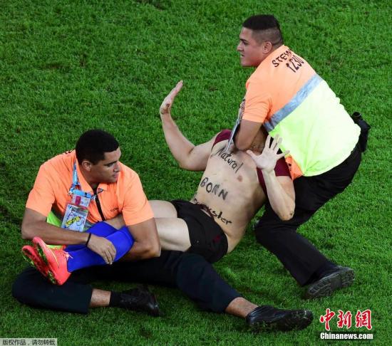 这名疯狂的球迷身穿紫红色T恤衫,但他把上衣掀起露出了上半身,下身穿着短裤、蓝色球袜和红色球鞋。他跑入场内,还试图强吻德国铁卫赫韦德斯,不过他很快被安保人员摁住,并架出了赛场。