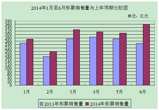 2014年7月15日,财政部公布了6月份彩票[微博]销售情况,统计了半年销售情况。6月份,全国共销售彩票360.54亿元,比上年同期(简称“同比”)增加113.08亿元,增长45.7%。由于世界杯原因,体育彩票机构销售192.4亿元,同比增加多达87.27亿元,增长83%。1月至6月累计,全国共销售彩票1784.1亿元,同比增加287.01亿元,增长19.2%,今年全年销量有望再次突破3000亿大关。