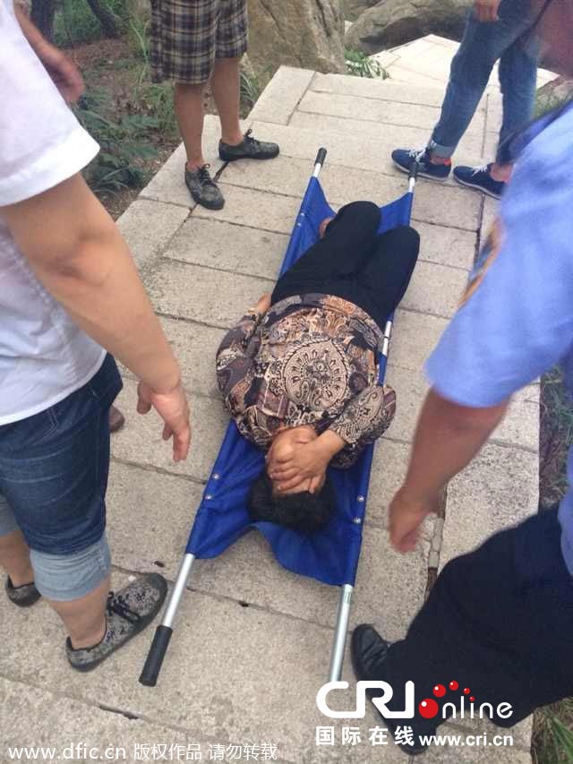 一位老人中途不适被工作人员用担架抬下山。图片来源:东方IC