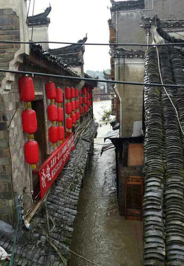 湖南湘西凤凰古城境内的沱江水位猛涨,古城大部分区域进水,景区已经关闭。