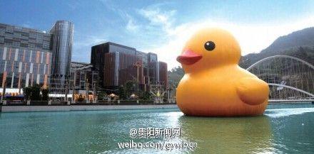 【大黄鸭被冲走了!】据@贵阳交通广播 报道:由于暴雨,贵阳水东路上环球嘉年华的大黄鸭已经被冲走了,如果沿线有朋友看到这个18米高的大黄鸭,请与5961027联系。