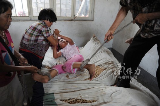 随着年龄越来越大,绑在婷婷身上的布条和绳子也越来越多。15日下午,姥姥绑住婷婷手腕的时候,她不停的喊,“疼,疼啊!”