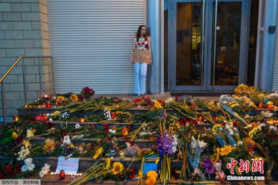 7月17日,乌克兰基辅,民众们手持鲜花和蜡烛在荷兰驻乌大使馆前悼念马航MH17事故遇难者