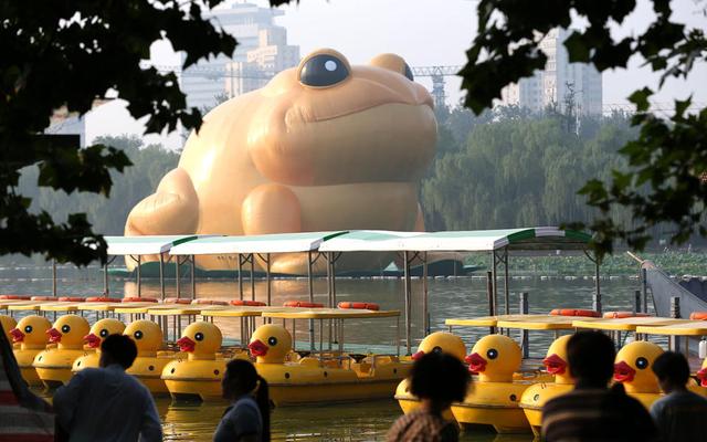 22米高的充气金蟾浮在玉渊潭的湖面上